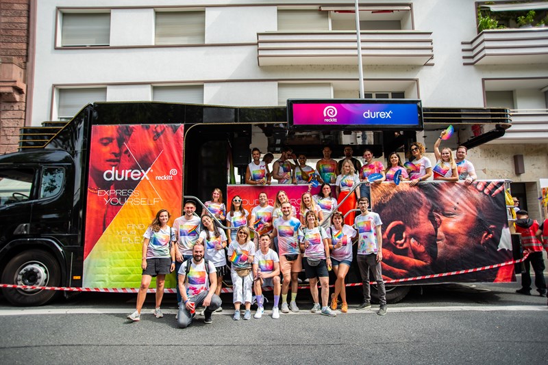 Zudem machen wir uns vor Ort für LGBTQ+ Rechte stark. Gemeinsam mit unseren Partnern Alle Farben und F/A/Q haben wir am CSD Köln teilgenommen und mit dem Durex Team und den Menschen vor Ort Flagge gezeigt. Auch auf dem CSD in Mannheim haben sich mehr als 35 Kolleginnen und Kollegen aus unterschiedlichen Abteilungen zusammengefunden und auf unserem ersten Pride Truck die Vielfalt zelebriert. Neben unserer CSD-Präsenz waren wir in Zusammenarbeit mit Edeka während des Lesben- und Schwulenstraßenfestes in Berlin vertreten: Direkt am Nollendorfplatz in Schöneberg - eine Location, die ein beliebter Treffpunkt der LGBTQ+-Community ist – haben wir mit einem Sampling und Promotion Stand und guter Musik sexuelle Selbstbefreiung gefeiert.