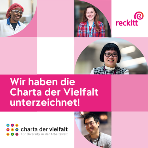 Die Charta der Vielfalt ist eine Initiative zur Förderung von Vielfalt in Unternehmen und Institutionen. Mit der Unterzeichnung der Charta der Vielfalt setzt Reckitt ein klares Zeichen für Vielfalt und Toleranz in der Arbeitswelt und signalisiert die Wertschätzung aller Mitarbeitenden unabhängig von Alter, ethnischer Herkunft und Nationalität, Geschlecht und geschlechtlicher Identität, körperlichen und geistigen Fähigkeiten, Religion und Weltanschauung, sexueller Orientierung und sozialer Herkunft.