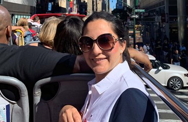 Amandeep wearing sunglasses on open top bus